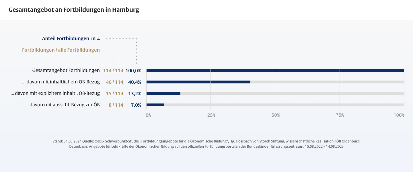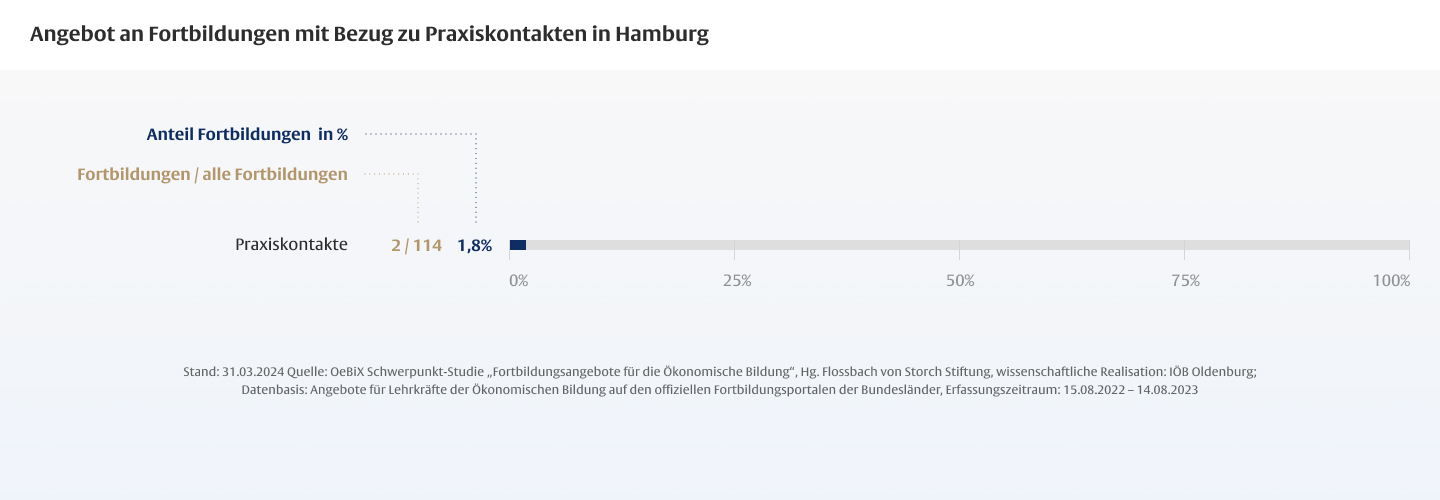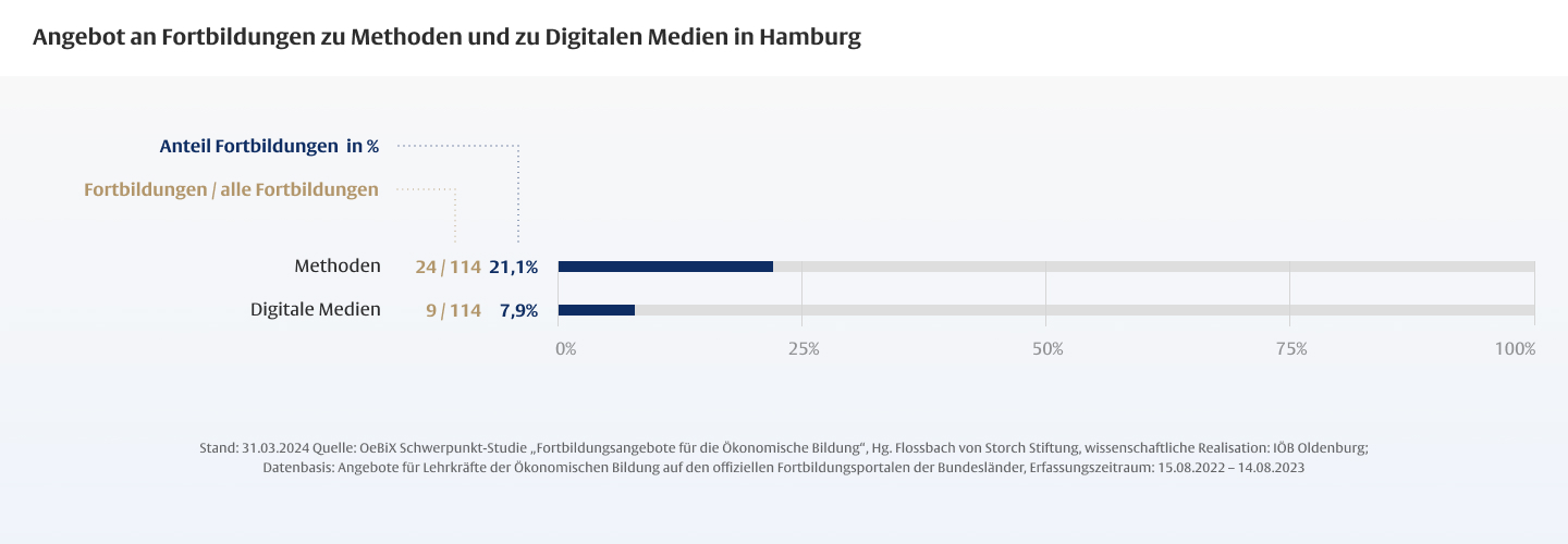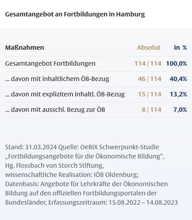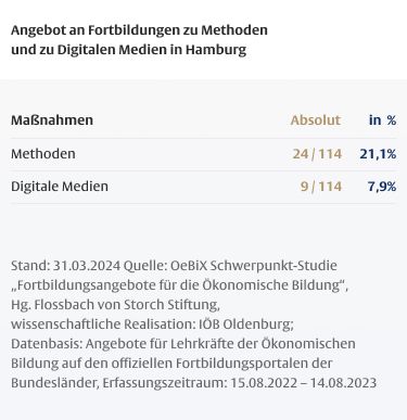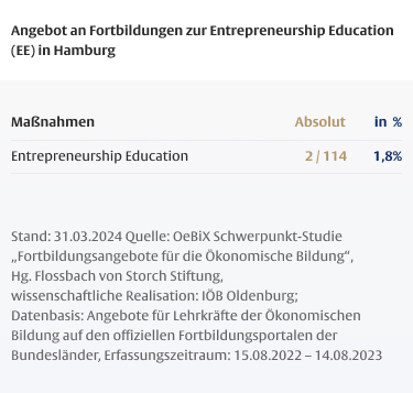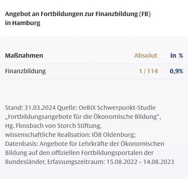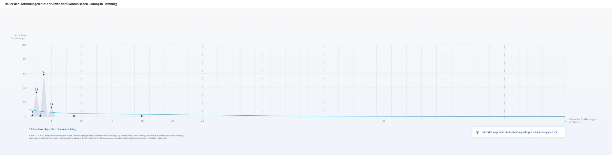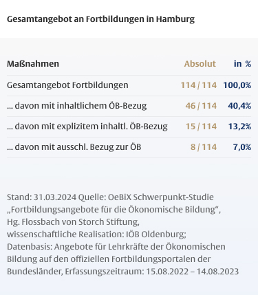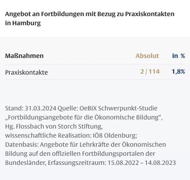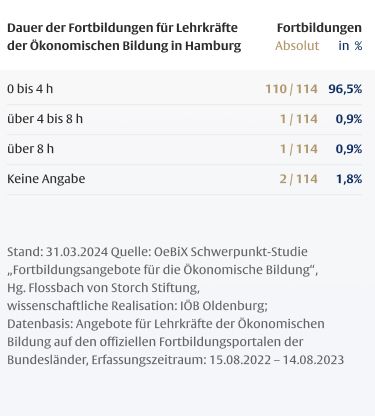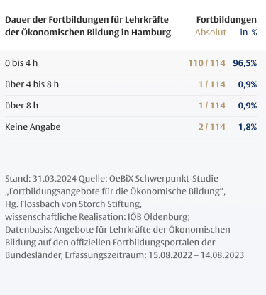 Die Dauer von Fortbildungen für Lehrkräfte ist mitentscheidend für deren Wirksamkeit, wobei insbesondere den so genannten One-Shot-Maßnahmen, die nur wenige Stunden dauern, ein geringes Wirkungspotenzial zugeschrieben wird. Vor dem Hintergrund des hohen Anteils fachfremd unterrichtender Lehrkräfte in der Ökonomischen Bildung ist der geringe Anteil längerer Maßnahmen besonders problematisch.