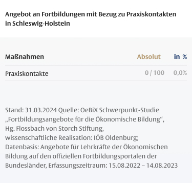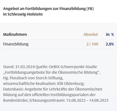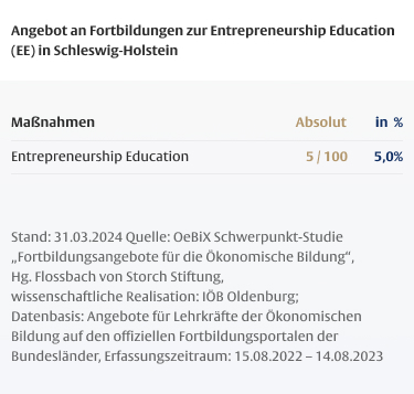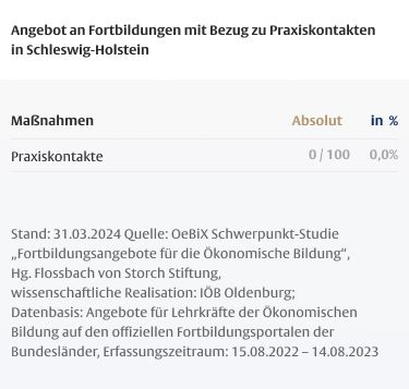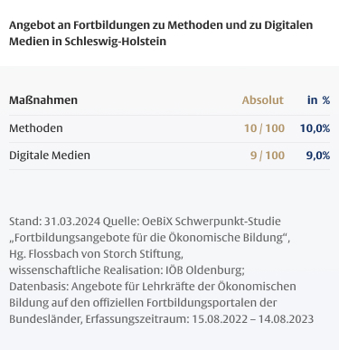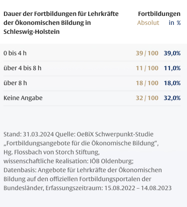 Die Dauer von Fortbildungen für Lehrkräfte ist mitentscheidend für deren Wirksamkeit, wobei insbesondere den so genannten One-Shot-Maßnahmen, die nur wenige Stunden dauern, ein geringes Wirkungspotenzial zugeschrieben wird. Vor dem Hintergrund des hohen Anteils fachfremd unterrichtender Lehrkräfte in der Ökonomischen Bildung ist der geringe Anteil längerer Fortbildungen besonders problematisch.