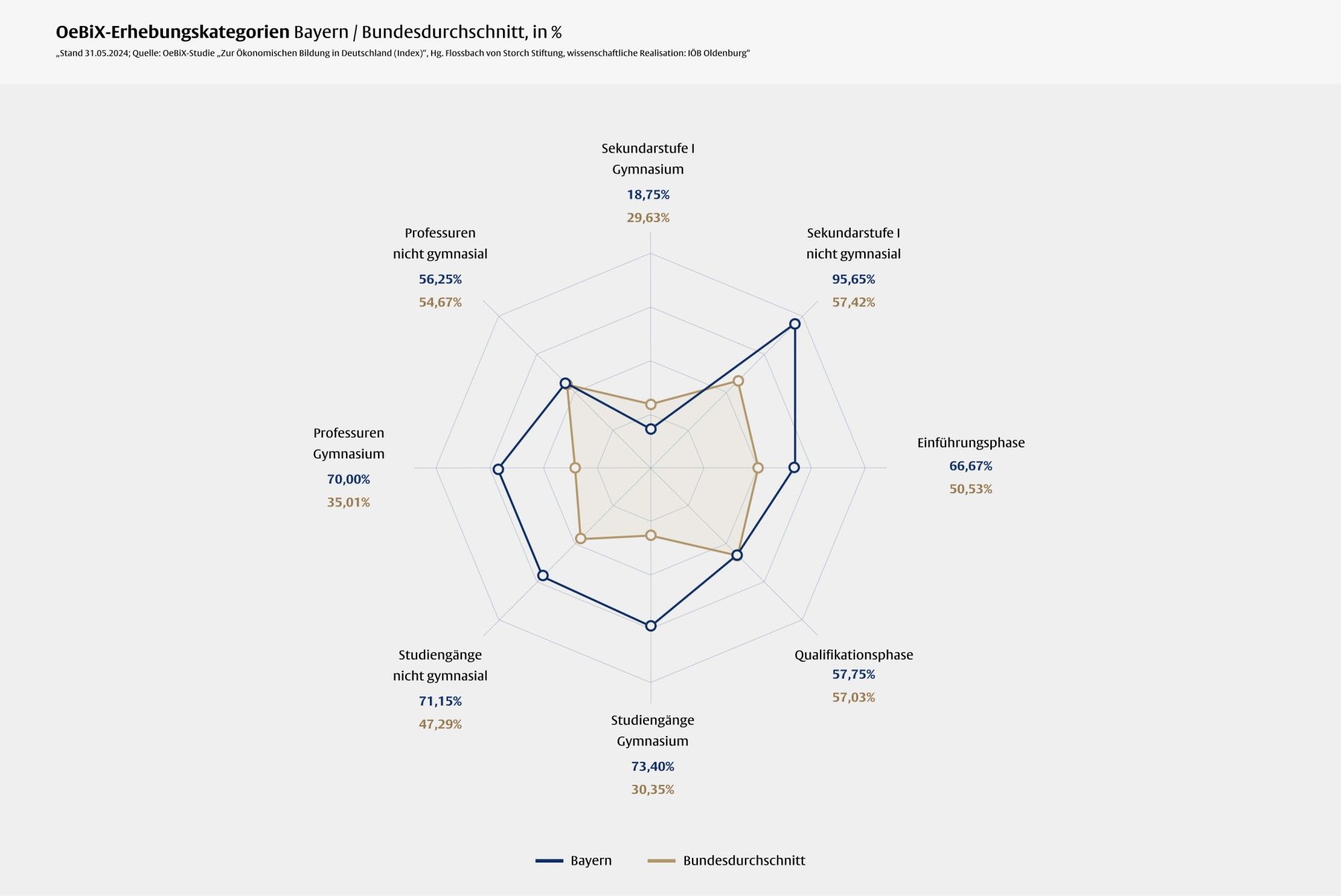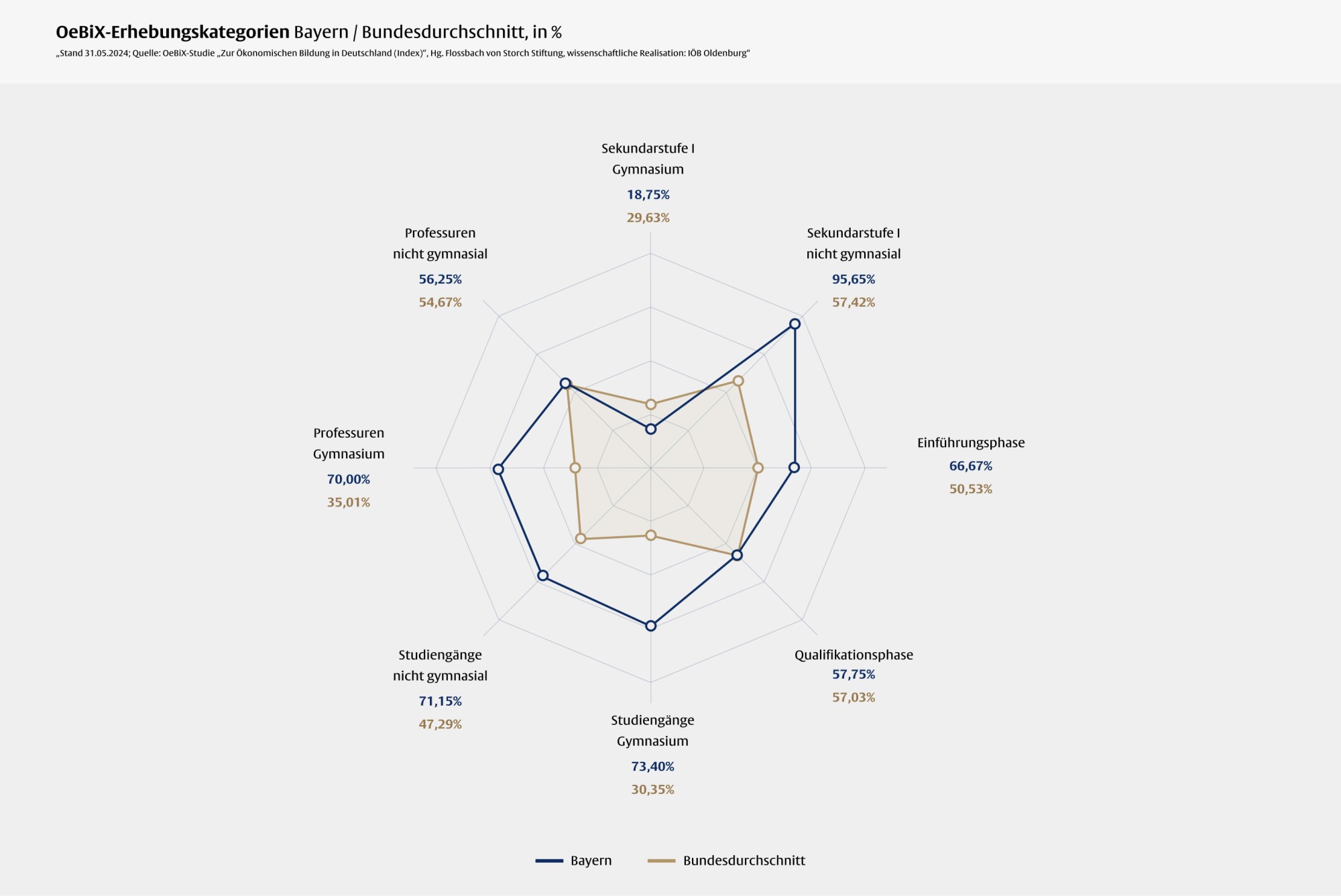 Im Bundeslandvergleich schneidet Bayern in den meisten Erhebungskategorien, die in die OeBiX-Studie eingeflossen sind, überdurchschnittlich gut ab. In der Sekundarstufe I der nicht-gymnasialen Schulformen liegt Bayern im Durchschnitt bei 95,65 Prozent und erfüllt damit annähernd das Maß von sechs Kontingentstunden im Pflicht- und Wahlpflichtbereich der Sekundarstufe I für ein normales Nebenfach. Auch in der Lehrkräftebildung liegt Bayern in den meisten Bereichen oberhalb des optimierungsbedürftigen Bundesdurchschnitts. Bei den Professuren (nicht-gymnasial) schneidet Bayern knapp überdurchschnittlich ab. Optimierungspotenzial gibt es bei der Verankerung der Ökonomischen Bildung in der Sekundarstufe I des Gymnasiums. Hier liegt Bayern mit 18,75 Prozent relativ deutlich unter dem Bundesdurchschnitt von 29,63 Prozent.