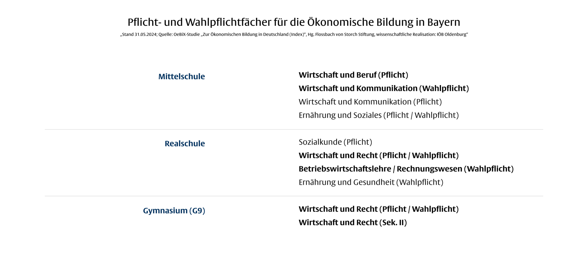 In der Mittelschule sowie in der Realschule ist die Ökonomische Bildung in Bayern vergleichsweise gut verankert. Das Fach Wirtschaft und Beruf wird in der Mittelschule in den Jahrgängen fünf bis acht als eigenständiges Pflichtfach mit insgesamt fünf Kontingentstunden unterrichtet. Die Rahmenbedingungen für die Ökonomische Bildung im Gymnasium weisen hingegen Optimierungspotenziale auf. Dies gilt insbesondere für die Sekundarstufe I. Auch hinsichtlich der Wirtschaftslehrkräftebildung bestehen Defizite. An mehreren Hochschulen, die Wirtschaftslehrkräfte ausbilden, fehlen wirtschaftsdidaktischen Professuren.