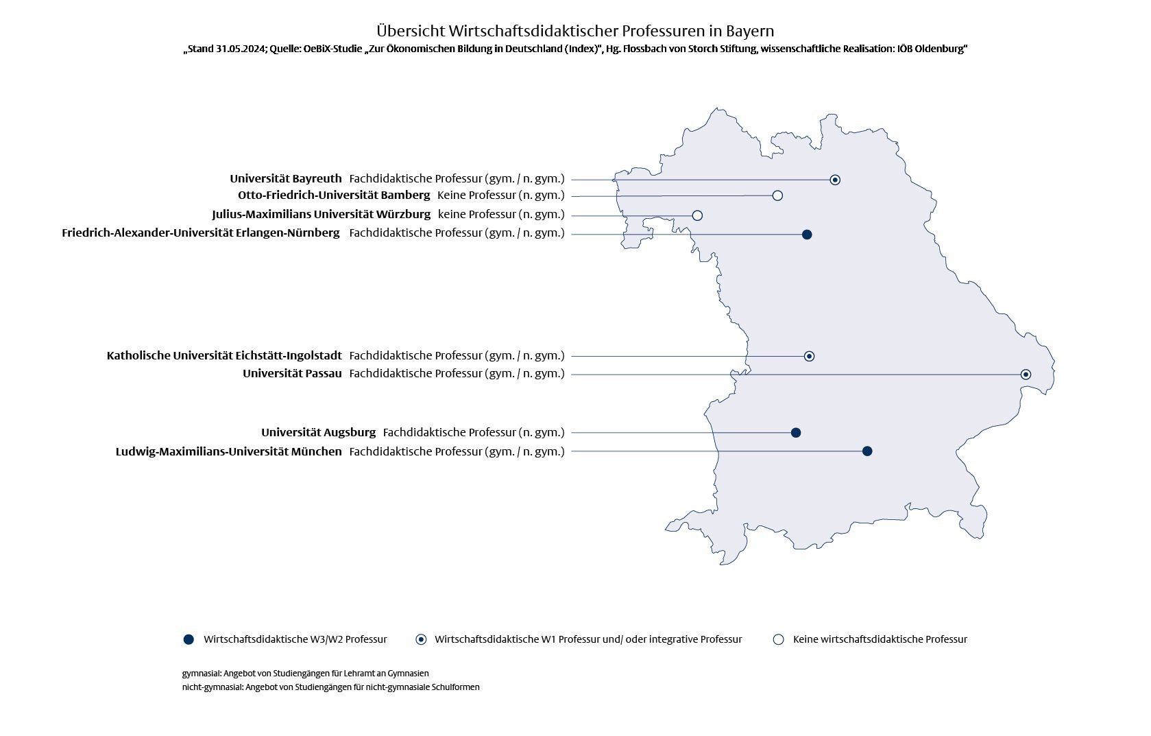Die Hochschulen sind mit Blick auf die wirtschaftsdidaktischen Professuren in Bayern sehr heterogen ausgestattet. Volle wirtschaftsdidaktische Professuren gibt es nur an drei Standorten. An ebenso vielen Standorten gibt es keine wirtschaftsdidaktische Professur. An drei Hochschulen sind Akademische Oberräte für die wirtschaftsdidaktische Ausbildung zuständig.