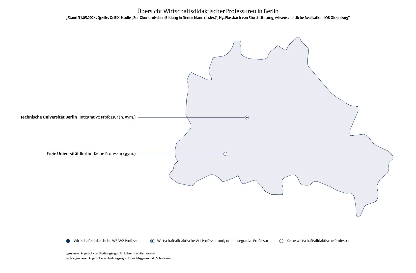 In der gymnasialen Lehrkräftebildung gibt es in Berlin keine wirtschaftsdidaktische Professur. Für die weiterführenden allgemeinbildenden nicht-gymnasialen Schulformen ist eine integrative Professur an der TU Berlin vorhanden.