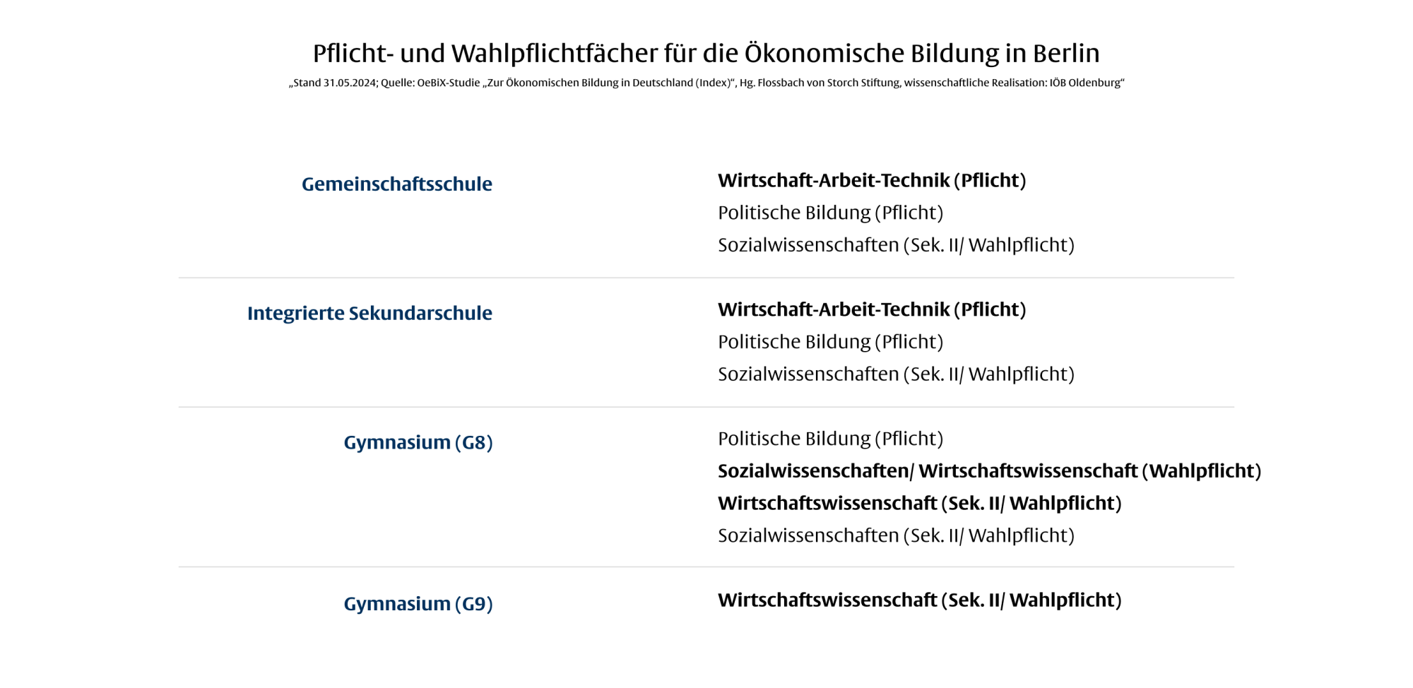 Bei der Ökonomischen Bildung in Berlin besteht noch immer Verbesserungsbedarf: An keiner weiterführenden allgemeinbildenden Schulform gibt es ein eigenständiges Pflichtfach Wirtschaft. Auch die Wirtschaftslehrkräftebildung ist zum Teil defizitär, vor allem bei den wirtschaftswissenschaftlichen und wirtschaftsdidaktischen Inhalten in den Studiengängen für Wirtschaftslehrkräfte. Hier bestehen vor allem Optimierungspotenziale. Zumindest in der Qualifikationsphase in der gymnasialen Oberstufe in Berlin sind wirtschaftliche Inhalte gut verankert, hier können die Schülerinnen und Schüler ein eigenständiges Fach Wirtschaft wählen.