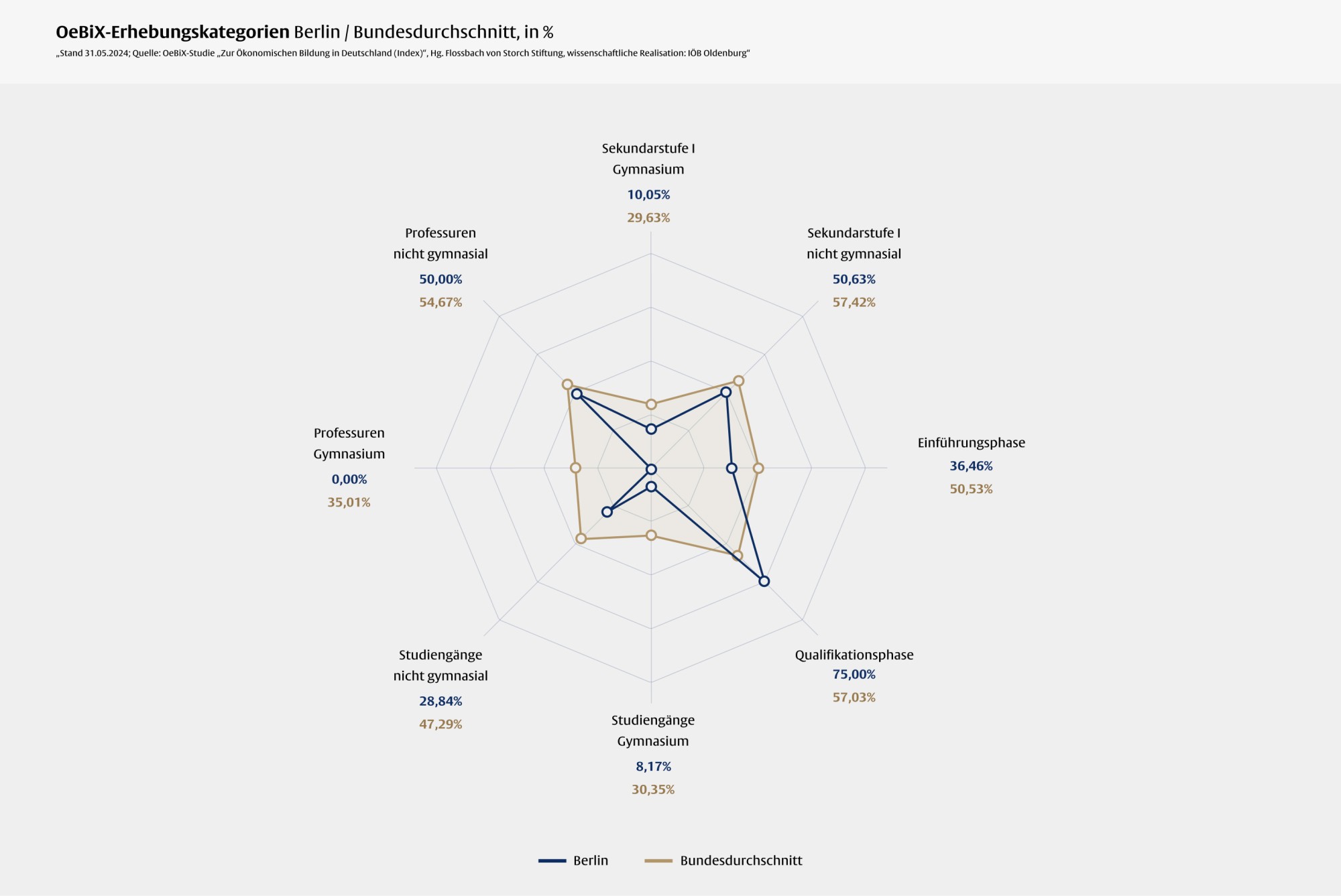 In allen Erhebungskategorien der OeBiX-Studie schneidet Berlin unterdurchschnittlich ab - einzige Ausnahme: Die Qualifikationsphase der Sekundarstufe II. Hier erreicht Berlin 75,00 Prozent.