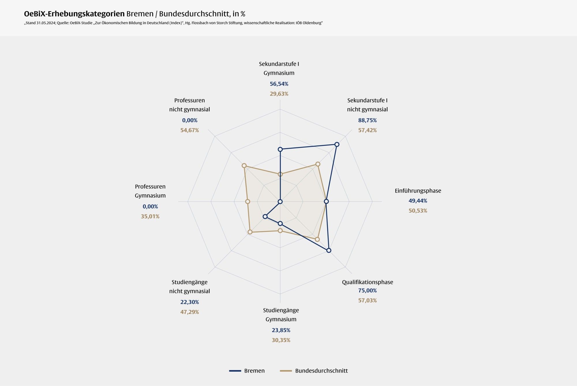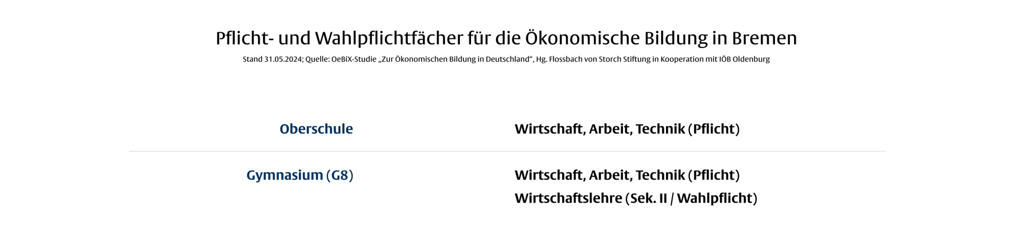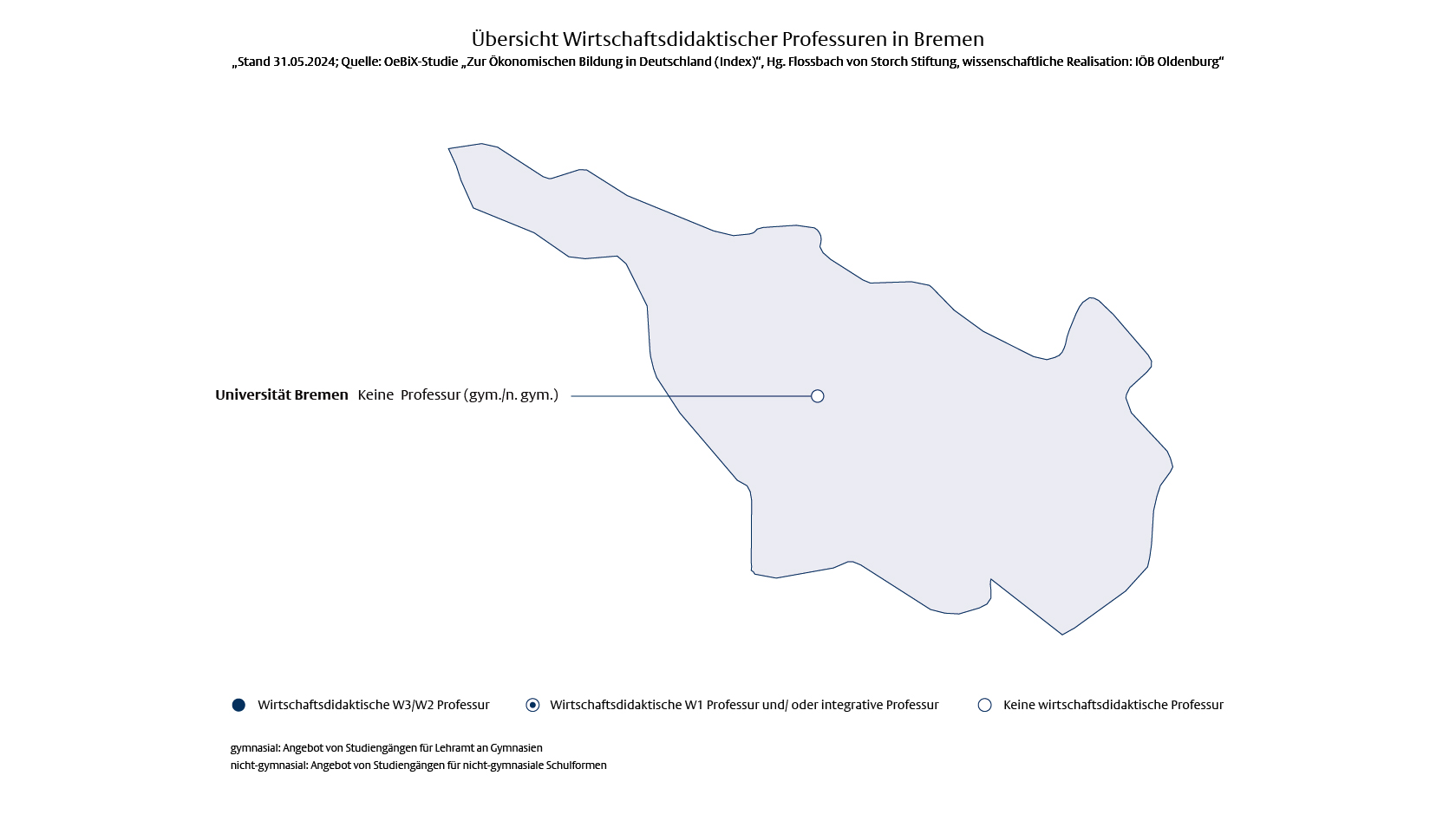 In Bremen ist die Ökonomische Bildung vor allem in der Sekundarstufe I der Oberschule gut verankert. In der Qualifikationsphase der gymnasialen Oberstufe können Schülerinnen und Schüler ein eigenständiges Fach Wirtschaft wählen. Ein eigenständiges Pflichtfach Wirtschaft gibt es in Bremen jedoch an keiner weiterführenden allgemeinbildenden Schulform. Viel Luft nach oben besteht in Bremen hinsichtlich der gymnasialen und nicht-gymnasialen Wirtschaftslehrkräftebildung. Bremen belegt im entsprechenden Teilindex für die Lehrkräftebildung den letzten Platz.