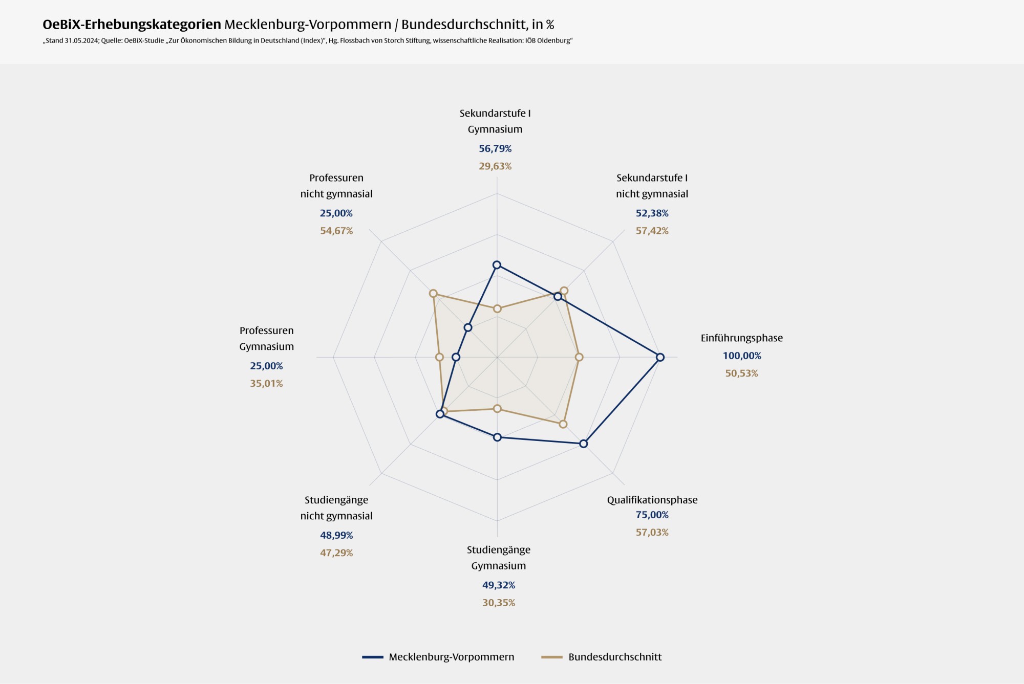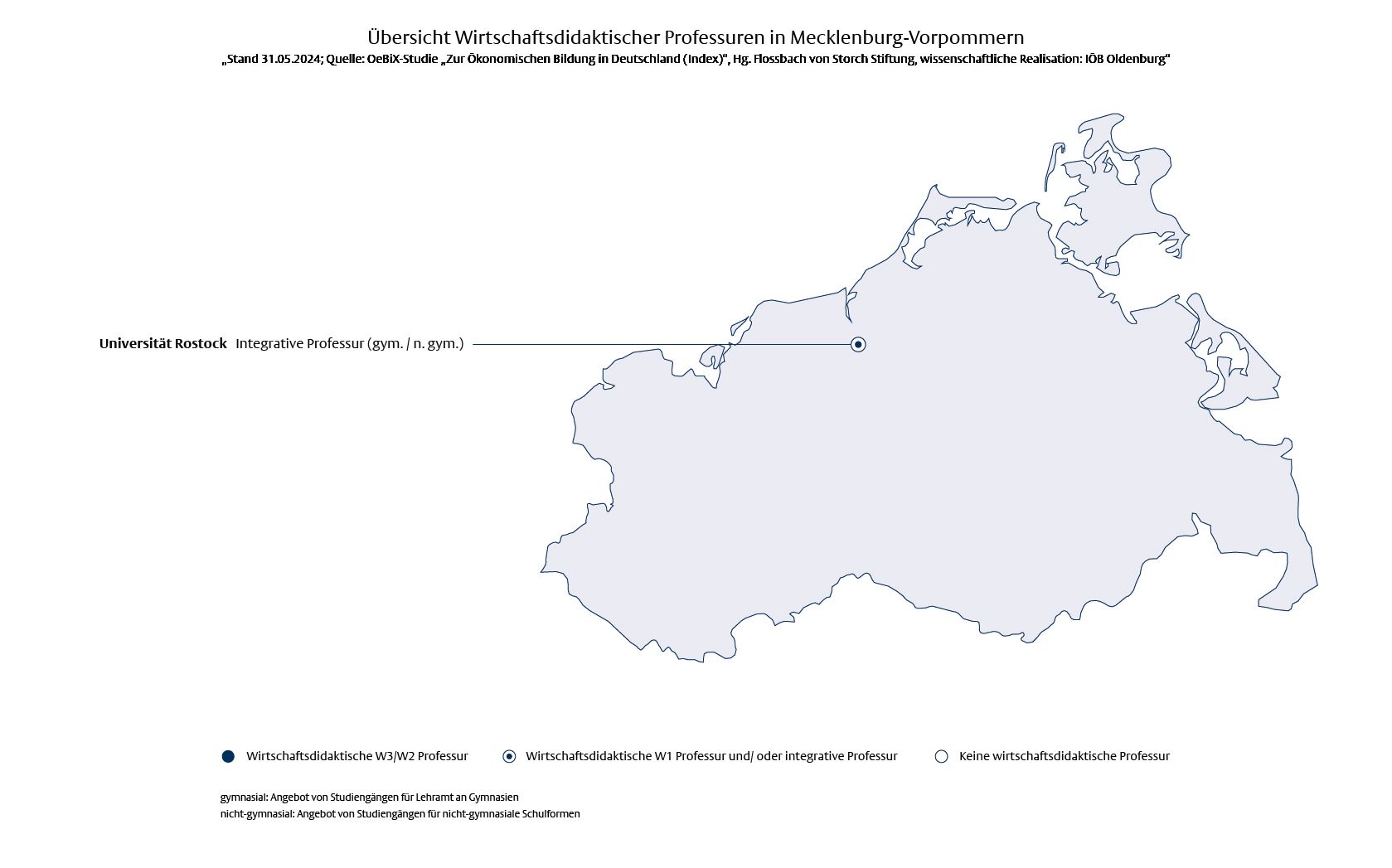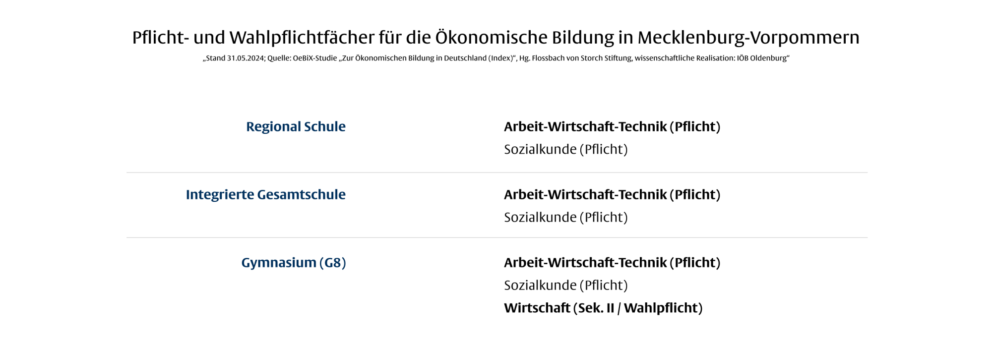 Ein für alle Schülerinnen und Schüler verpflichtendes eigenständiges Fach Wirtschaft gibt es in Mecklenburg-Vorpommern an keiner weiterführenden allgemeinbildenden Schulform. Allerdings können die Schülerinnen und Schüler in der gymnasialen Oberstufe ein eigenständiges Fach Wirtschaft wählen. Optimierungspotenziale gibt es in Mecklenburg-Vorpommern insbesondere in der Wirtschaftslehrkräftebildung im Hinblick auf die gymnasialen und nicht-gymnasialen Professuren.