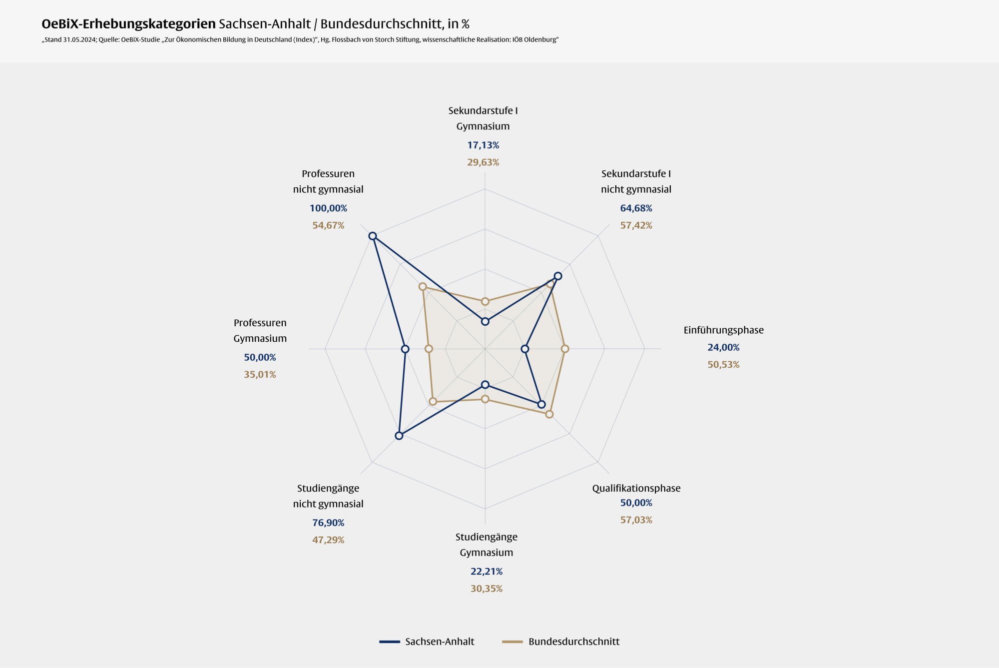 Sachsen-Anhalt erreicht in einigen Erhebungskategorien Werte, die zum Teil sehr deutlich über dem Bundesdurchschnitt liegen. Dies betrifft die Kategorien Sekundarstufe I nicht-gymnasial, die Studiengänge nicht-gymnasial sowie die Professuren - sowohl gymnasial als auch nicht-gymnasial. Bei der Erhebungskategorie „Professuren nicht-gymnasial“ erreicht Sachsen-Anhalt 100 Prozent. Auch im Teilindex Lehrkräftebildung liegt Sachsen-Anhalt über dem Bundesdurchschnitt. Im Gegensatz dazu schneidet das Bundesland in einigen Erhebungskategorien zur schulischen Verankerung der Ökonomischen Bildung am Gymnasium unterdurchschnittlich ab. In der Erhebungskategorie "Sekundarstufe I Gesamt" liegt Sachsen-Anhalt mit 45,66 Prozent leicht unter dem Bundesdurchschnitt von 46,3 Prozent.