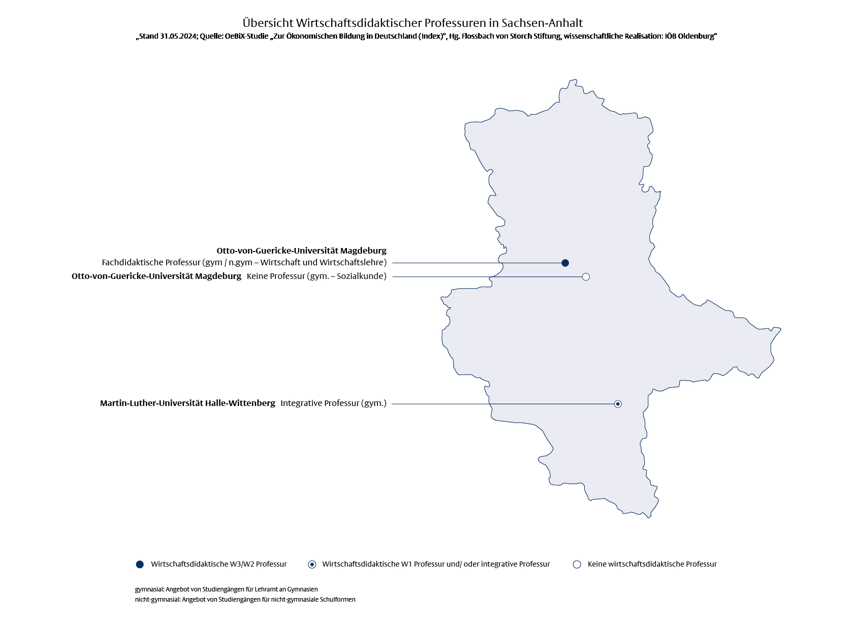 Sachsen-Anhalt belegt im OeBiX-Gesamtindex den achten Platz. Das ist unter anderem auf die Verankerung der Ökonomischen Bildung in den Sekundar-, Gemeinschafts- und Integrierten Gesamtschulen zurückzuführen. So gibt es in Sachsen-Anhalt an allen weiterführenden allgemeinbildenden Schulformen, außer am Gymnasium, ein eigenständiges Pflichtfach Wirtschaft. Auch in der Wirtschaftslehrkräftebildung für diese nicht-gymnasialen Schulformen ist Sachsen-Anhalt gut aufgestellt. An dem Hochschulstandort, an dem die Wirtschaftslehrkräftebildung für das Lehramt an Sekundar- und Gemeinschaftsschulen (Sekundarstufe I) erfolgt, gibt es eine wirtschaftsdidaktische Professur. Auch sind wirtschaftswissenschaftliche und wirtschaftsdidaktische Inhalte gut in diesem Studiengang verankert. Optimierungspotenziale gibt es auch bei der Ökonomischen Bildung am Gymnasium.