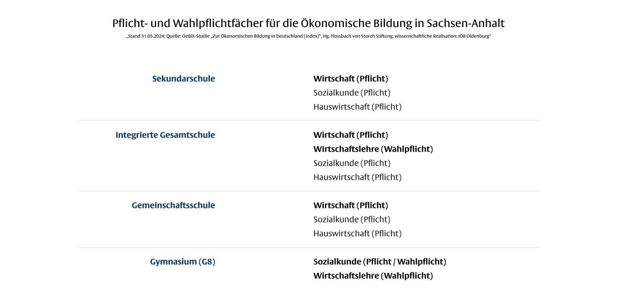 Mit vier Kontingentstunden im Pflichtbereich ist die Ökonomische Bildung in Sachsen-Anhalt an der Integrierten Gesamtschule am besten verankert. Es folgen weitere nicht-gymnasiale Schulformen: Die Sekundarschule sowie die Gemeinschaftsschule sind mit je 3,11 Kontingentstunden für die Ökonomische Bildung im Pflichtbereich ausgestattet. In der Sekundarstufe I des Gymnasiums sind im Pflichtbereich 0,54 Kontingentstunden für die Ökonomische Bildung vorgesehen. Schulformübergreifend lässt sich feststellen, dass Ökonomische Bildung in Sachsen-Anhalt im Pflichtbereich noch immer deutlich vom Maß für ein normales Nebenfachs von sechs Kontingentstunden im Pflichtbereich der Sekundarstufe I entfernt ist.