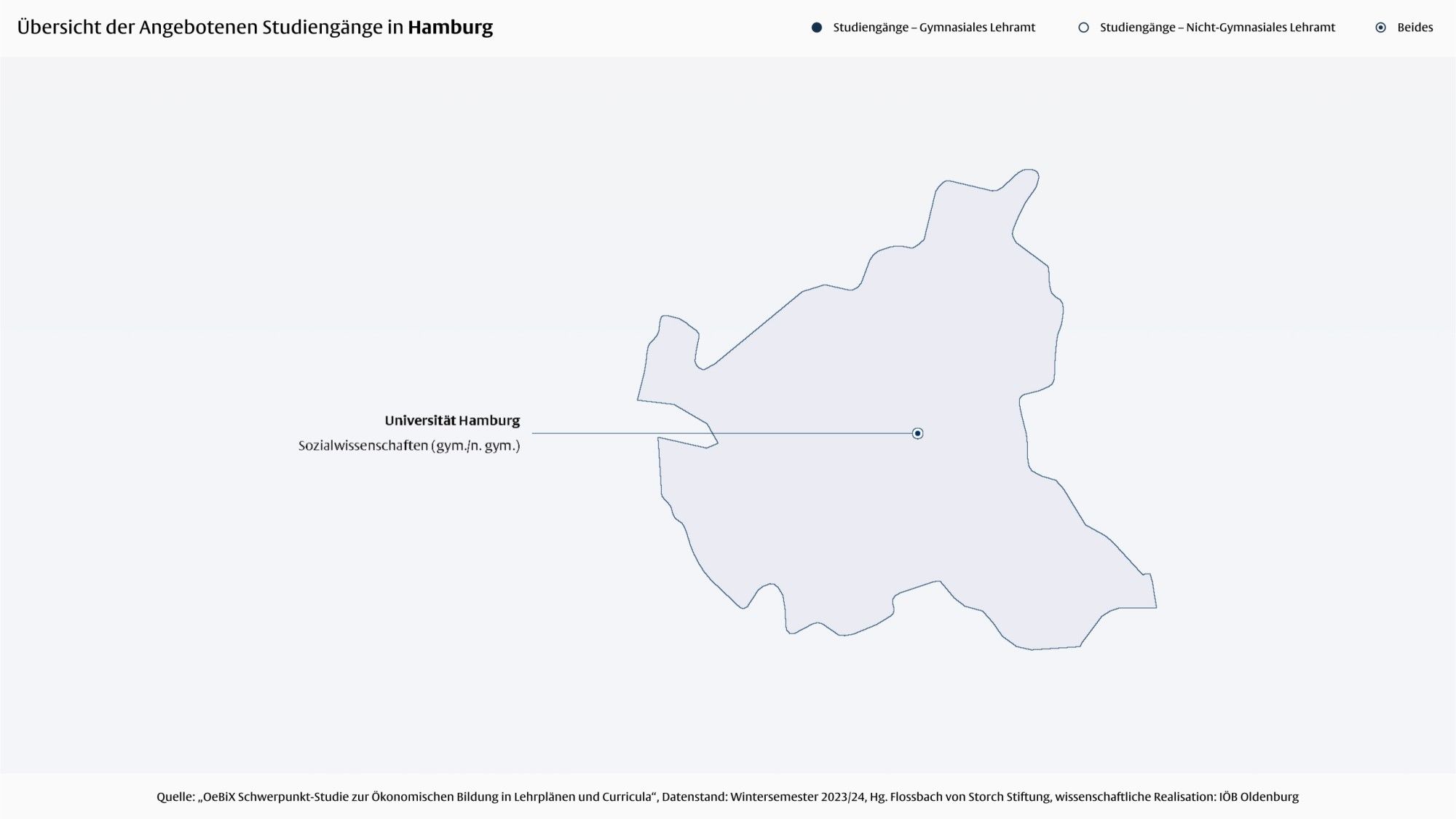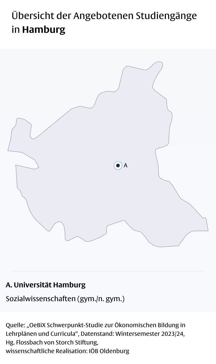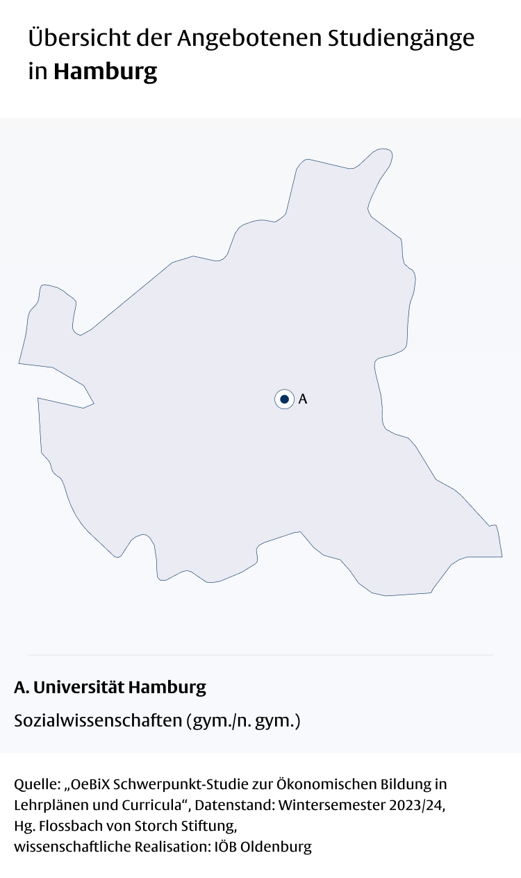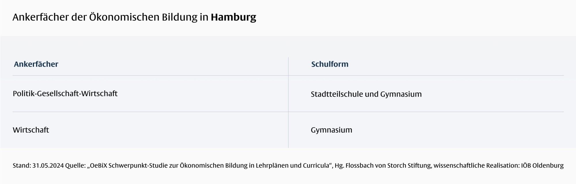 In Hamburg ist die Ökonomische Bildung im Fach Politik-Gesellschaft-Wirtschaft verankert. In der Sekundarstufe II an den Gymnasien besteht zudem das eigenständige Fach Wirtschaft. Mit einem Umfang von etwa einem Drittel ist die Ökonomische Bildung nur in geringem Maße in die entsprechenden Lehrpläne für das Fach Politik-Gesellschaft-Wirtschaft der Stadtteilschule und der Sekundarstufe I des Gymnasiums integriert. Wesentliche Inhaltsbereiche wie Markt, Unternehmen oder private Haushalte werden dabei berücksichtigt. Mehr als die Hälfte der Lehrpläne enthalten zudem explizit Inhalte der finanziellen Bildung und Entrepreneurship Education.