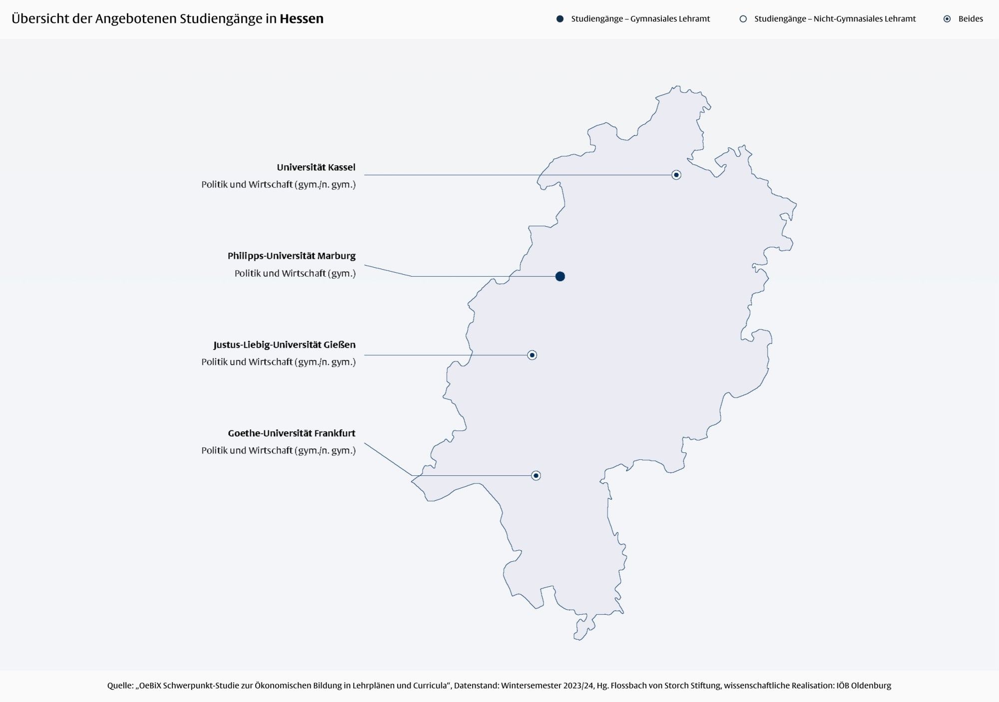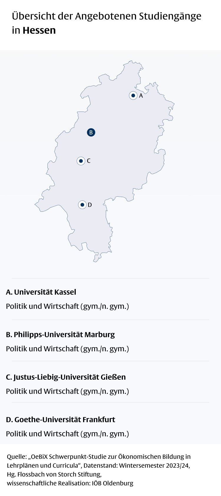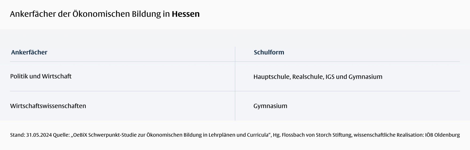 In Hessen ist die Ökonomische Bildung hinsichtlich des Umfangs und der inhaltlichen Breite am Gymnasium durch das Fach Politik und Wirtschaft und das Wahlpflichtfach Wirtschaftswissenschaften insgesamt gut abgedeckt. Wesentliche Inhaltsbereiche der Ökonomischen Bildung wie Internationale Wirtschaftsbeziehungen, Markt und Preisbildung, Unternehmen oder Staat werden hier berücksichtigt. Auch die Entrepreneurship Education und die finanzielle Bildung sind in den Lehrplänen weitestgehend abgedeckt.