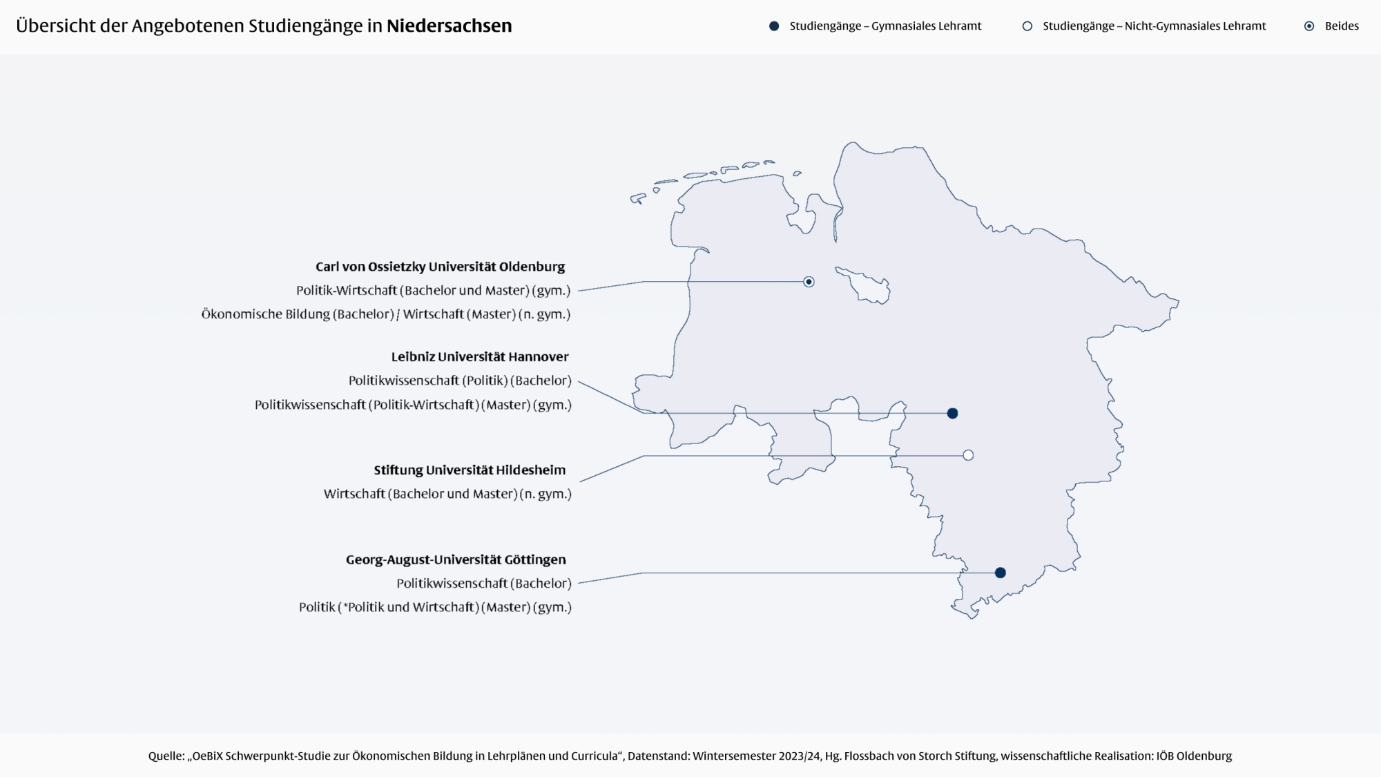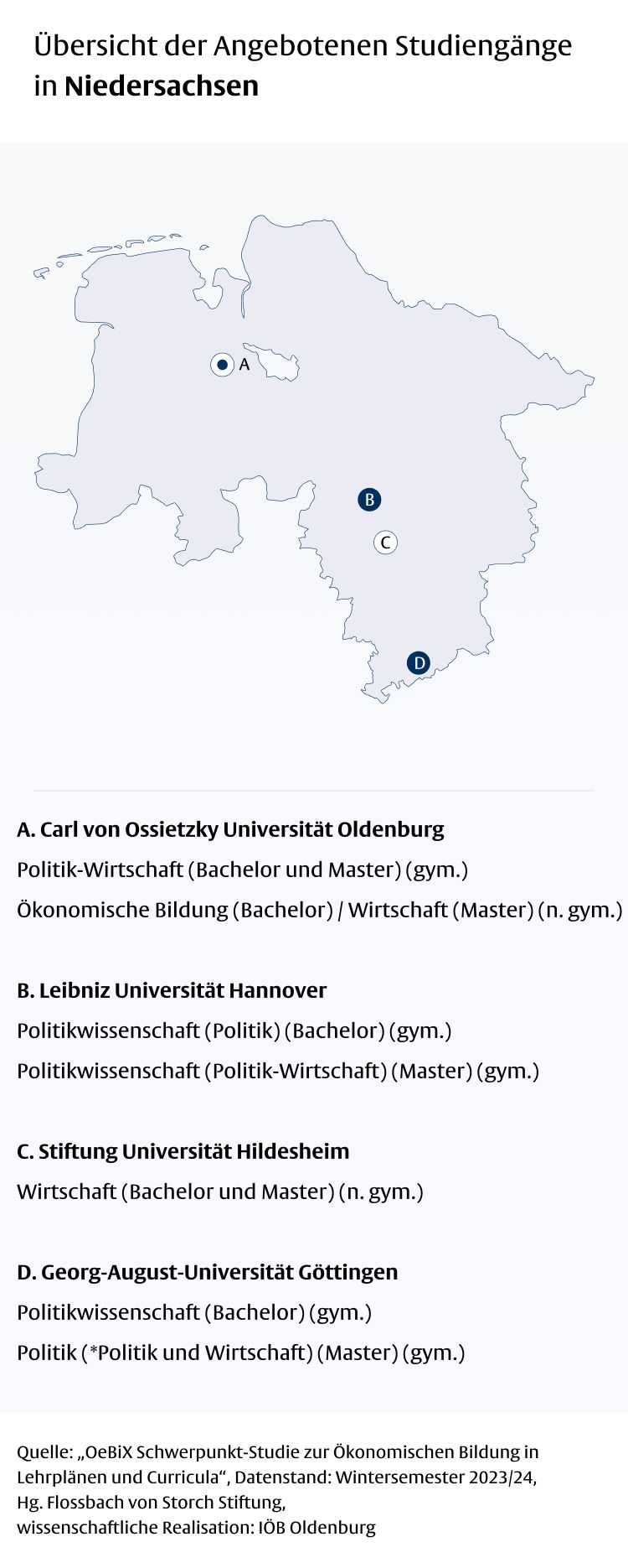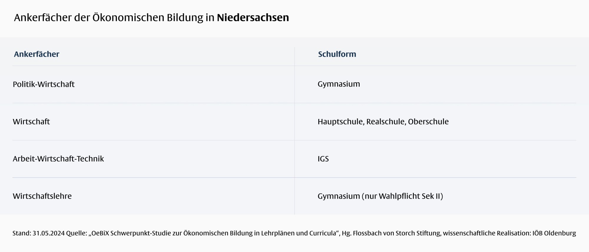 In Niedersachsen ist die Ökonomische Bildung in den Lehrplänen vor allem in den nicht-gymnasialen Schulformen Haupt-, Real- und Oberschule gut abgedeckt. Hier gibt es ein eigenständiges Pflichtfach Wirtschaft und ein darauf aufbauendes Wahlpflichtfach, in denen die Ökonomische Bildung hinsichtlich des Umfangs und inhaltlicher Breite gut verankert ist. Wesentliche Inhaltsbereiche der Ökonomischen Bildung wie Private Haushalte, Unternehmen und Staat werden hier umfassend berücksichtigt. Auch die Entrepreneurship Education ist in den meisten Lehrplänen enthalten, die finanzielle Bildung findet sich sogar in allen Lehrplänen für das Fach Wirtschaft in Niedersachen.