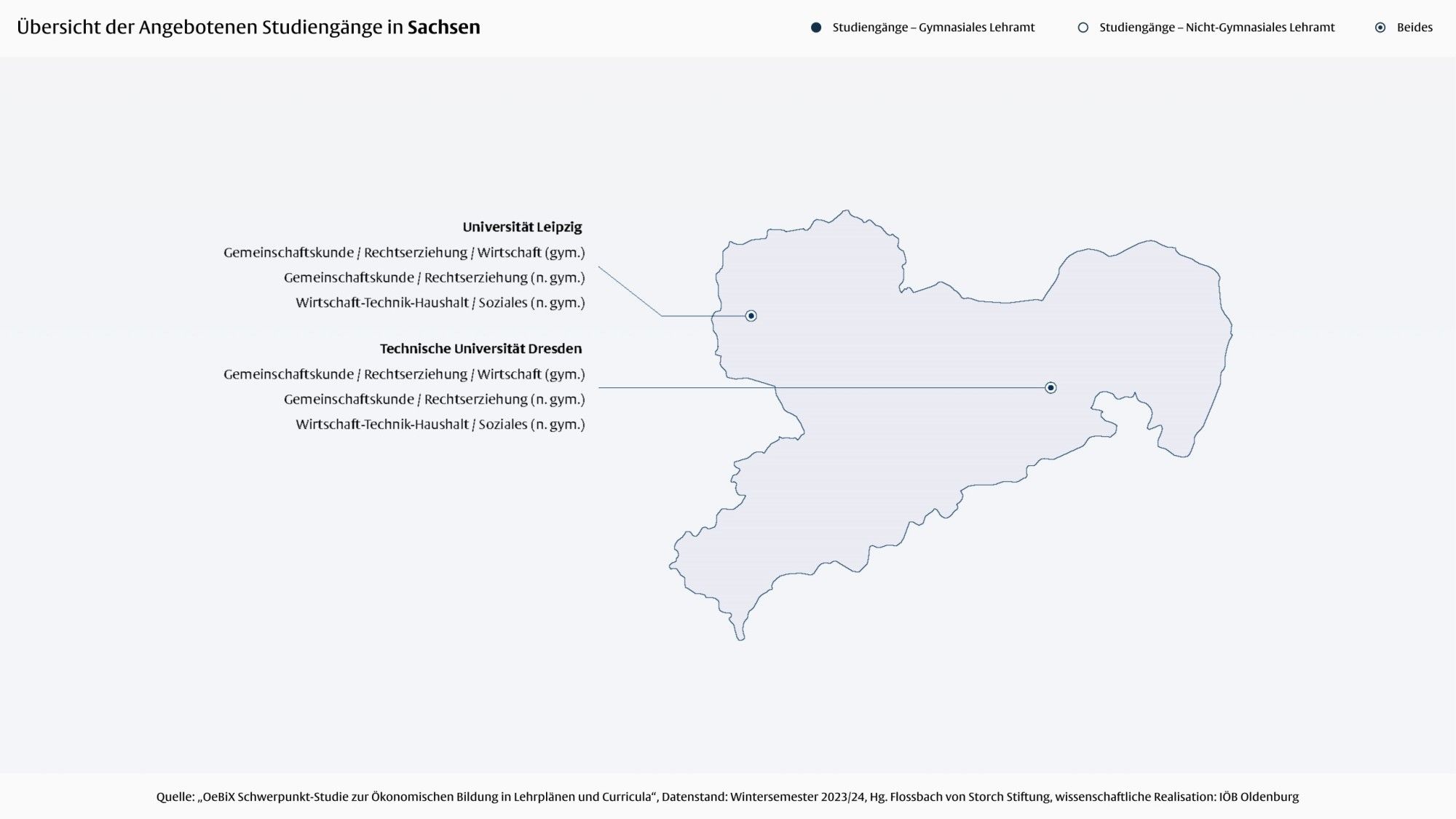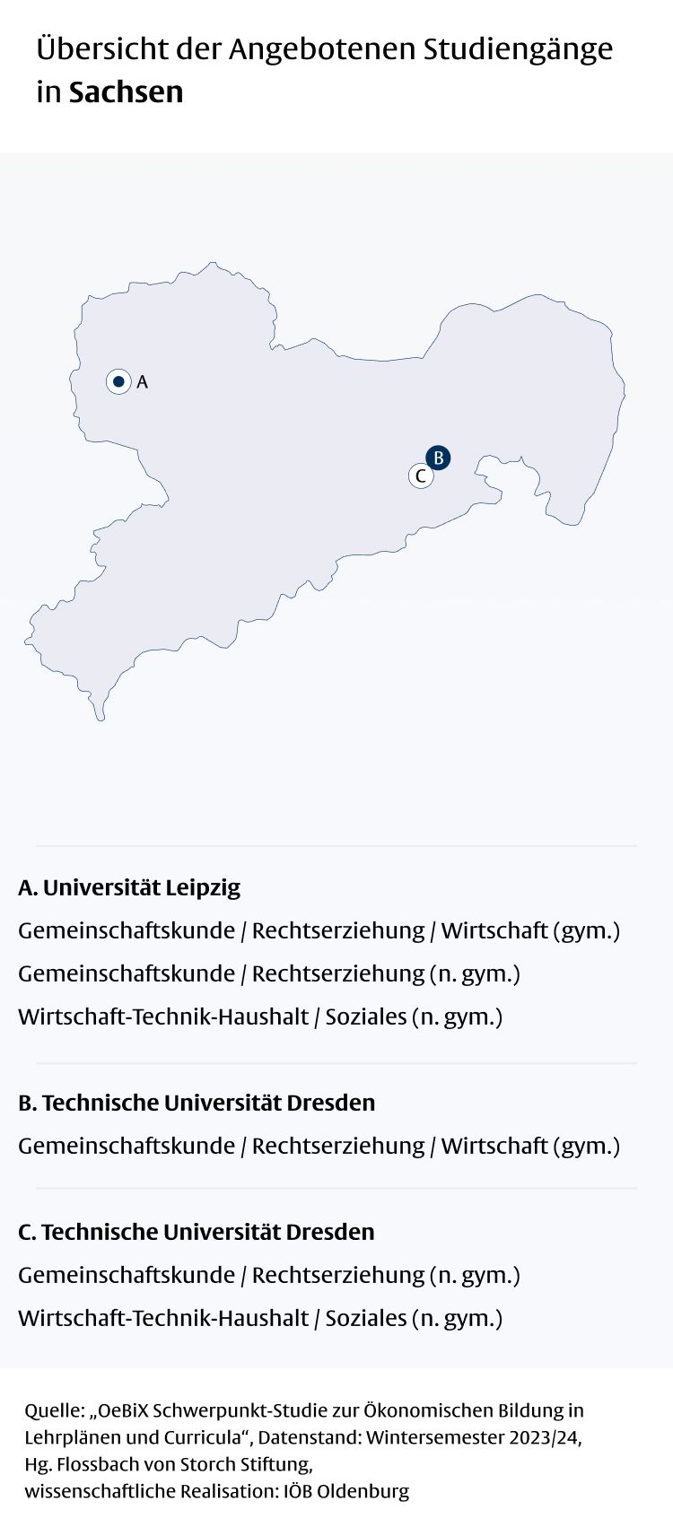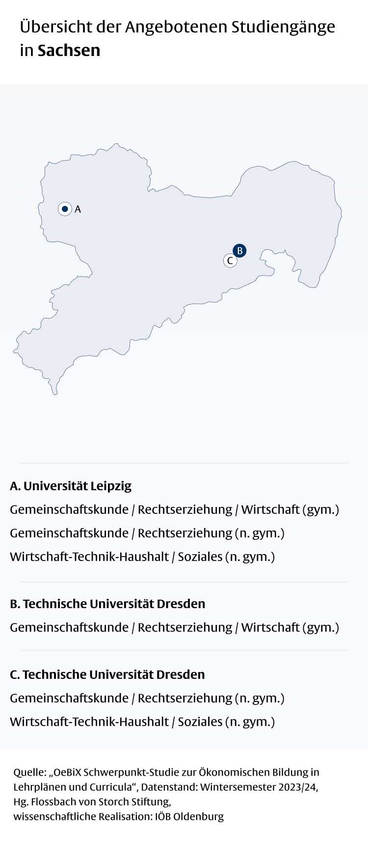 In Sachsen ist die Ökonomische Bildung hinsichtlich des Umfangs und der inhaltlichen Breite in fast allen weiterführenden allgemeinbildenden Schulformen durch die Fächer Gemeinschaftskunde/Rechtserziehung/Wirtschaft und Gesellschaftswissenschaftliches Profil (Gymnasium) sowie das Wahlpflichtfach Gemeinschaftskunde-Rechtserziehung (Oberschule) nur in geringem Maße abgedeckt. Wichtige wesentliche Inhaltsbereiche der Ökonomischen Bildung wie Private Haushalte, Unternehmen und Staat werden hier kaum berücksichtigt. Inhalte finanzieller Bildung sind in den Lehrplänen zumindest teilweise behandelt.