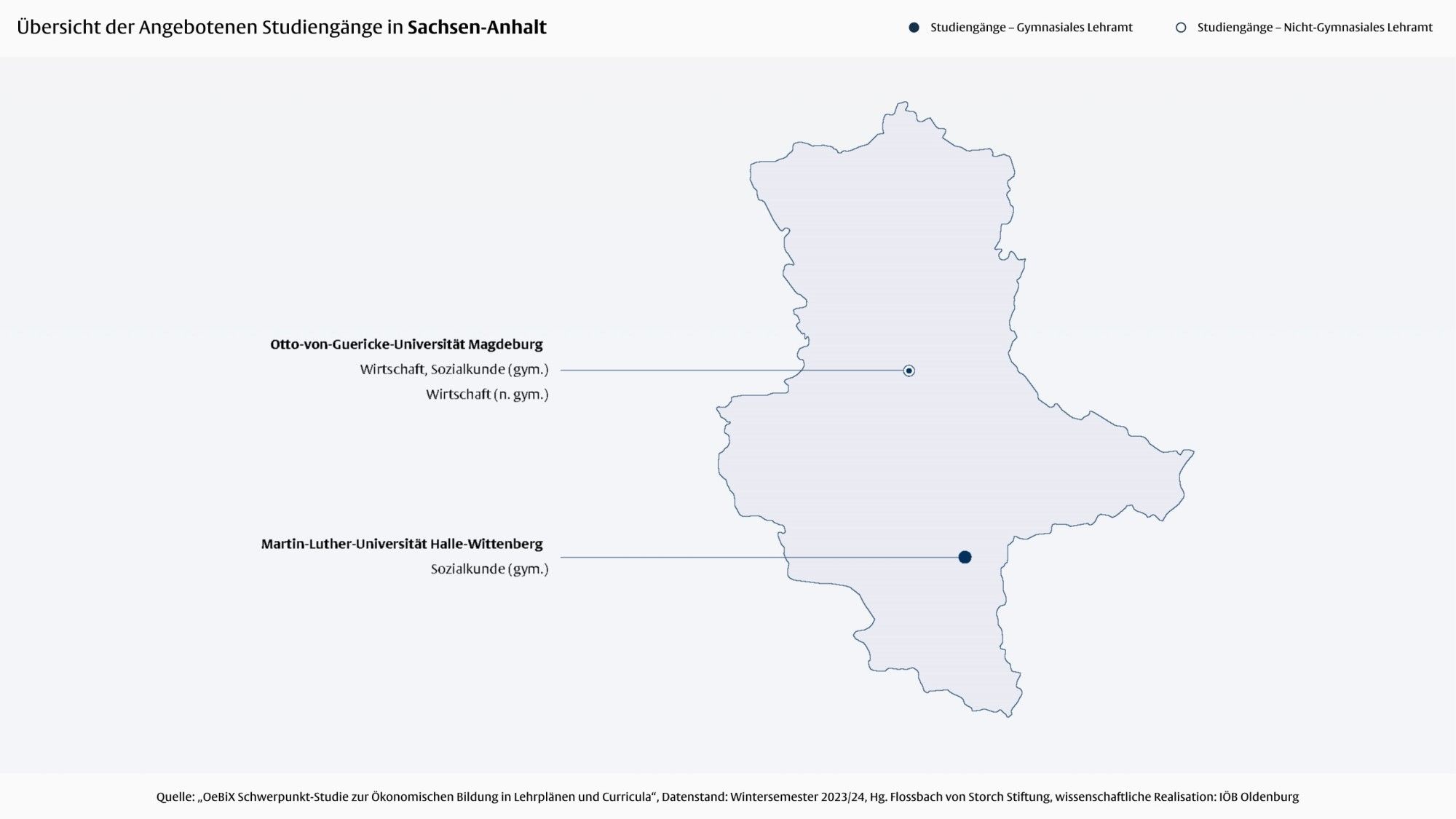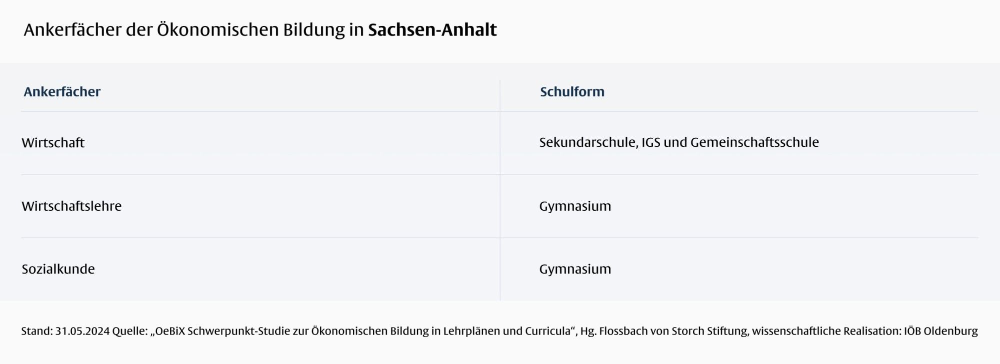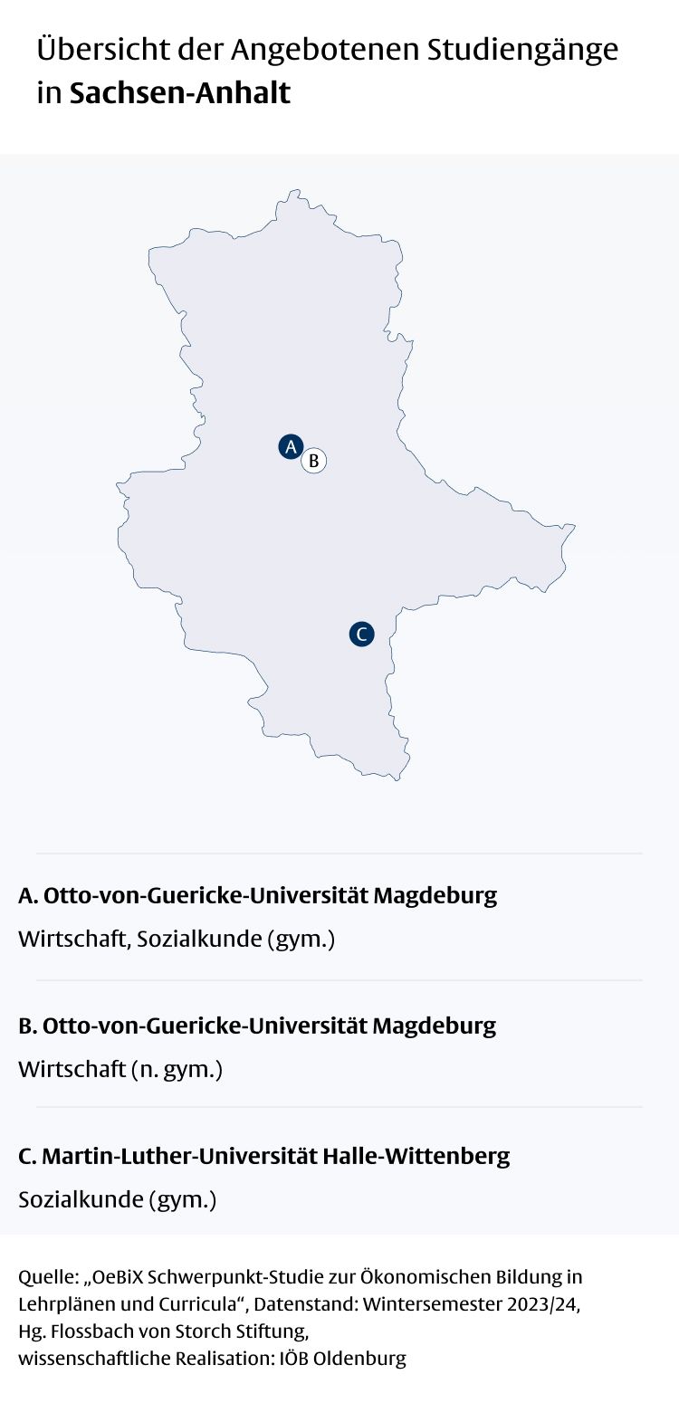 In Sachsen-Anhalt ist die Ökonomische Bildung hinsichtlich des Umfangs und der inhaltlichen Breite in allen weiterführenden allgemeinbildenden Schulformen durch das Fach Wirtschaft (nicht gymnasiale Schulformen) und das Wahlpflichtfach Wirtschaftslehre (Gymnasium) sehr gut abgedeckt. Wesentliche Inhaltsbereiche der Ökonomischen Bildung wie Private Haushalte, Unternehmen und Staat werden hier umfassend berücksichtigt. Auch die Entrepreneurship Education und die finanzielle Bildung sind in den Lehrplänen weitestgehend abgedeckt.