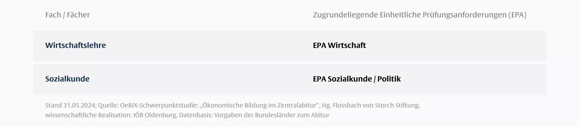 Die Fächer, in denen die Ökonomische Bildung verankert ist, unterscheiden sich zwischen den Bundesländern. Neben eigenständigen Fächern Wirtschaft und der Kombination aus Wirtschaft und Recht handelt es sich bei diesen Fächern vor allem um sozialwissenschaftliche Integrationsfächer, wie z. B. Politik-Wirtschaft oder Sozialkunde.