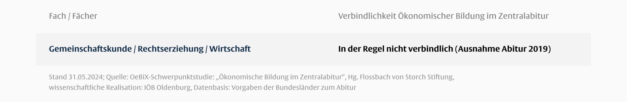 Die Fächer, in denen die Ökonomische Bildung verankert ist, unterscheiden sich zwischen den Bundesländern. Neben eigenständigen Fächern Wirtschaft und der Kombination aus Wirtschaft und Recht handelt es sich bei diesen Fächern vor allem um sozialwissenschaftliche Integrationsfächer, wie z. B. Politik-Wirtschaft oder Sozialkunde.